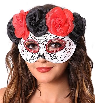 Día De Los Muertos Máscara Con Negro Y Rosa Roja Detalles