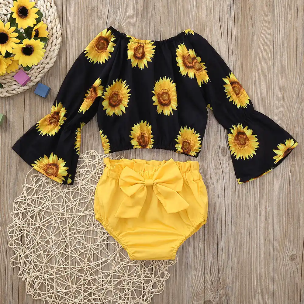 2 Uds Trajes De Verano Para Bebés Niñas Pascuas Con Estampado De Girasol De Manga Larga Conjunto De Pantalones Cortos 2t Ropa Para Niñas Ropa Para