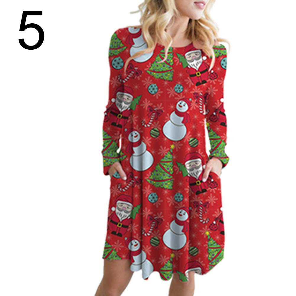 Litty089 Otoño Invierno Adorno Para Mujeres Muñeco De Nieve Diseño De Alce De Papá Noel Cuello O Manga Larga A Line Midi Vestido Con Bolsillo