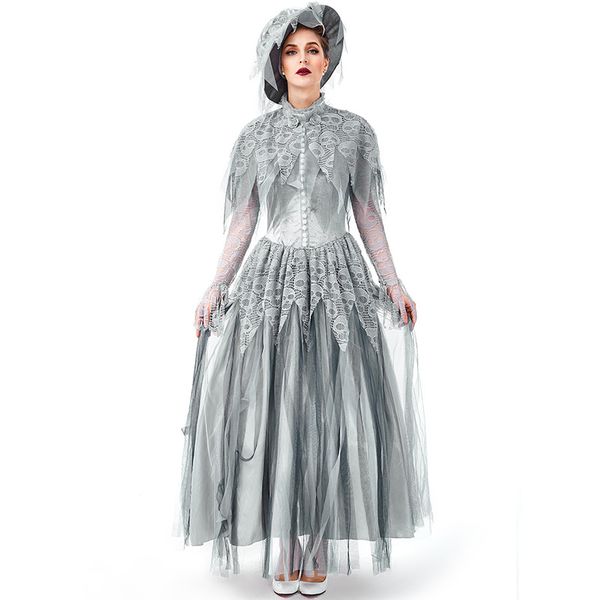 Compre Vestido De Novia Fantasma Gris Superior Mujeres Cráneo Traje De Cosplay Malla De Encaje Princesa Fantasma Vestido Largo Disfraz De Boda Zombie